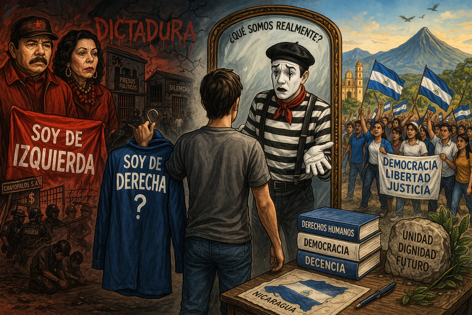 Imagínate esto: estás en una pelea a muerte con alguien que se viste de payaso. Y en lugar de quitarle el cuchillo que esconde detrás de la nariz roja, vos decidís vestirte de mimo. Así, más o menos, funciona la oposición nicaragüense en 2026 cuando insiste en definirse como «de derecha» solo porque Daniel Ortega y Rosario Murillo se pintaron de rojo hace cuatro décadas.
